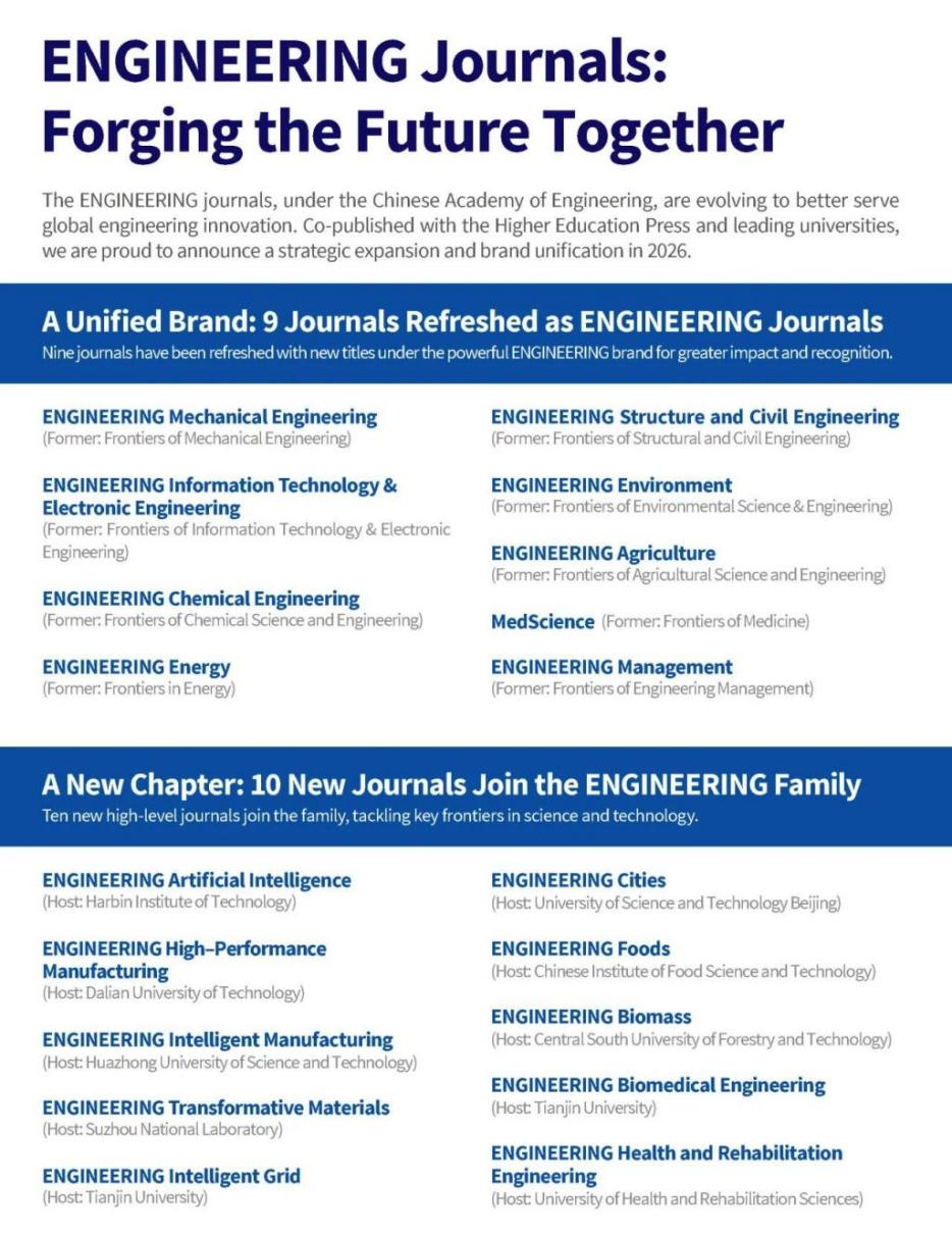 近日,中国工程院在北京召开“中国工程院Engineering刊群建设与发展会议”,正式发布“1+19”工程科技刊群体系。刊群在原有1本旗舰主刊《Engineering》(影响因子11.6,工程综合类世界排名前3)和9本子刊的基础上,对原有子刊重新命名,并新增10本子刊。Engineering期刊群将建设成为世界一流科技刊群,全面提升我国在国际工程科技领域的话语权与影响力。